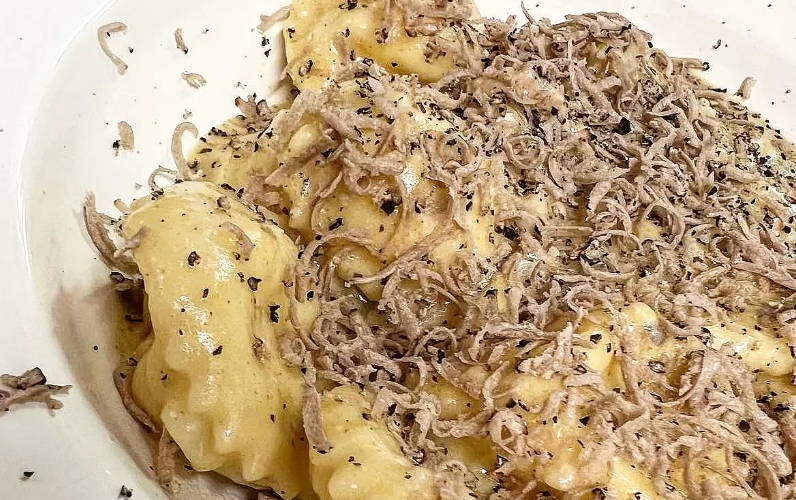 Posebno mesto je namenjeno tartufom — od carpaccia hobotnice s črnim tartufom, raviolov s kozicami in tartufi, do tarta z boškarinom in svežimi tartufi.
