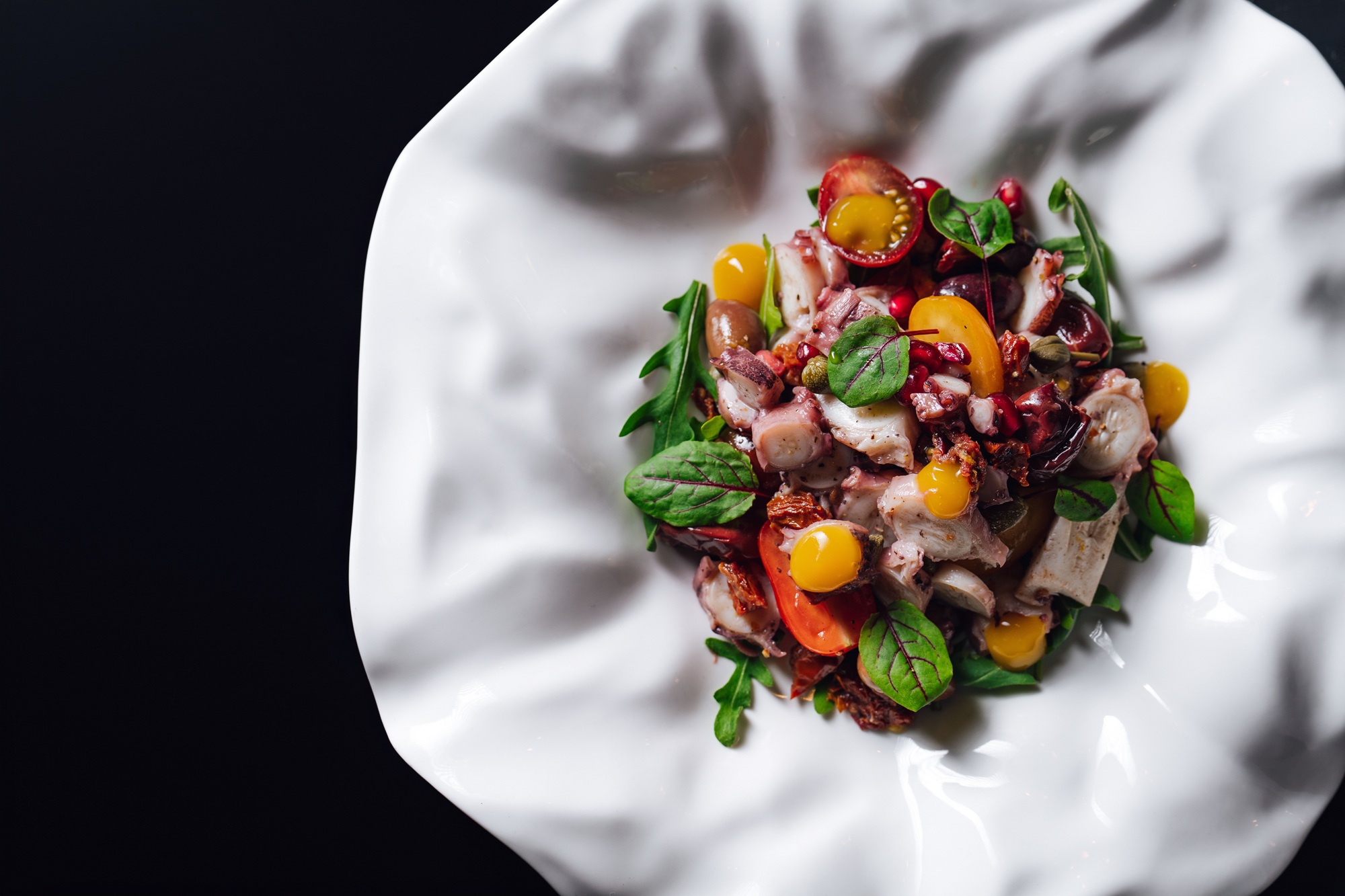 PREDJEDI (1) goveja paštetka s tartufi, medom ter figovim džemom (2) mozzarela burrata s pistacijevim pestom, drobljenimi pistacijami, češnjevim paradižnikom in extra deviškim oljčnim oljem (3) hobotnica v solati s kalamata olivami, kaprami, suhim paradižnikom, granatnim jabolkom in pasijonkinim gelom