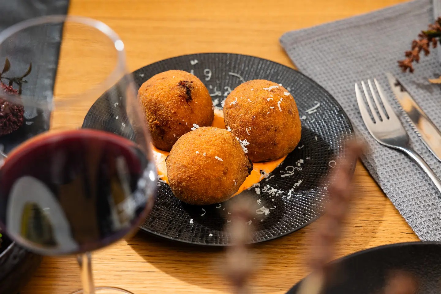 PREDJEDI (1) Parma pršut, narezan na tradicionalnem rezalniku Berkel (2) polnozrnat kruh iz droži, domače maslo (3) focaccia carbonara s črnim tartufom