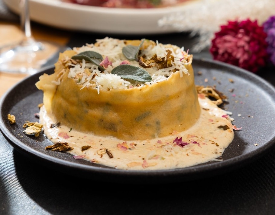 GLAVNE JEDI (1) Supplì – ocvrta lazanja, 60 dni zorjena slovenska Angus govedina v paradižnikovi omaki, čebulna marmelada, drobtine drožnega kruha (2) Raviol cacio e pepe – raviol po navdihu štruklja, jurčki, rikota in lokalni siri (3) Insalata Caprese z burrato